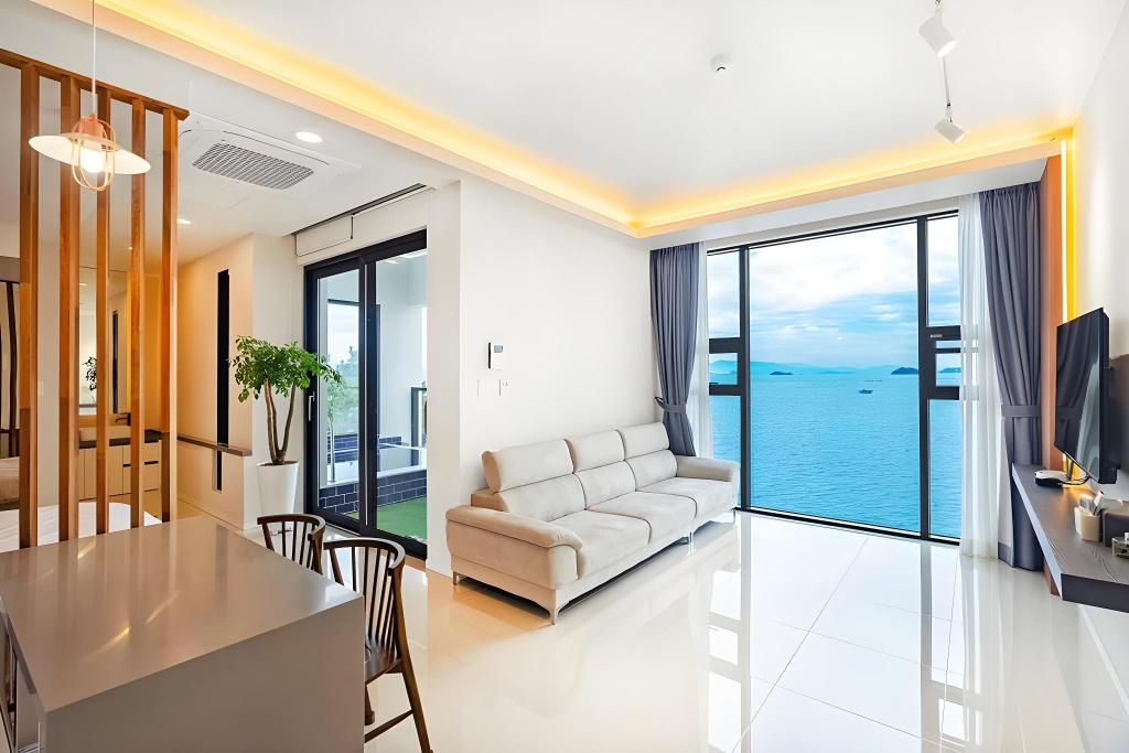 실내는 화이트 톤과 우드 소재를 조화롭게 사용해 차분하고 세련된 분위기를 자아냅니다. 벽난로 스타일의 조명과 대형 소파, 전면 유리창이 주는 개방감까지 더해져 럭셔리한 휴식을 선사합니다. 침구는 프리미엄 호텔 수준으로 푹신하고 청결하며, 욕실에는 욕조와 레인샤워 시설이 갖춰져 있어 스파처럼 활용할 수 있습니다.