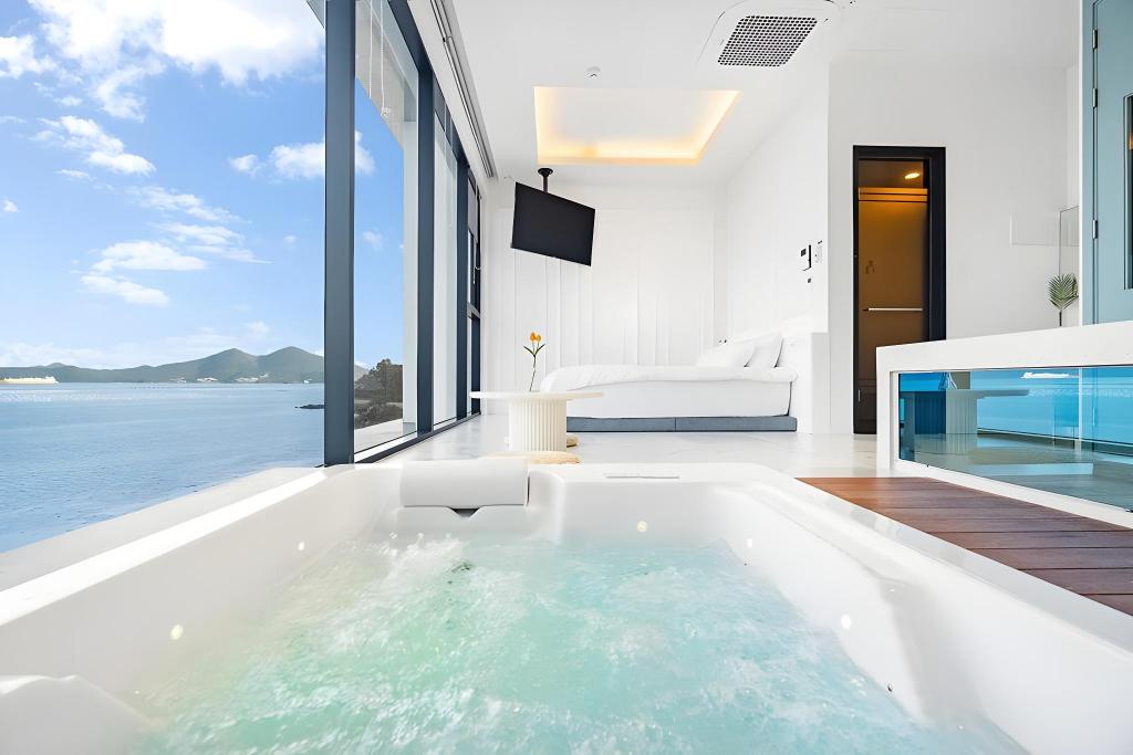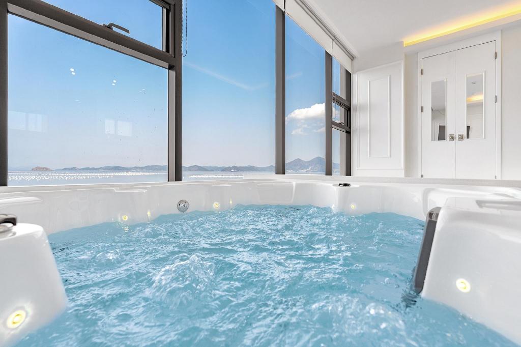 라모타의 가장 큰 특징은 모든 객실이 ‘개별 수영장’을 갖추고 있다는 점입니다. 고급 풀빌라답게 관리가 매우 잘 되어 있으며, 수온 조절이 가능해 사계절 내내 사용이 가능합니다. 유리창 너머로는 거제 앞바다가 시원하게 펼쳐져 있어, 수영을 하면서도 바다 전망을 감상할 수 있습니다. 특히 일몰 시간에는 수영장에서 석양을 감상하는 순간이 잊을 수 없는 추억이 됩니다.
