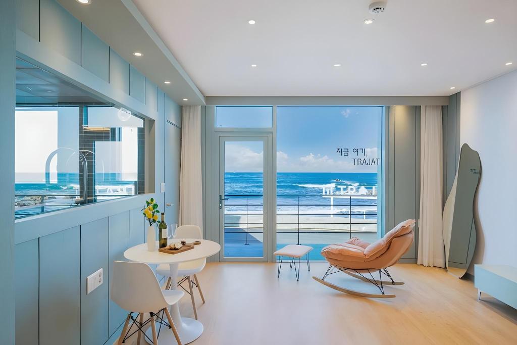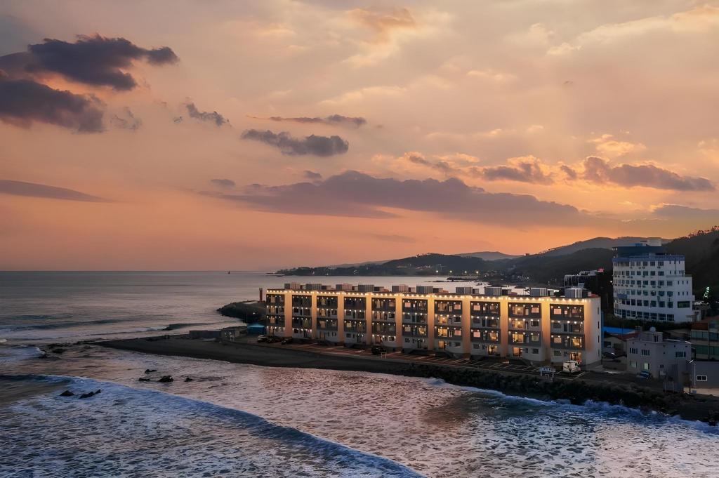 전 객실이 바다를 바라보는 통창 구조로 설계되어 있으며, 일부 방은 양옆 건물의 간섭이 적다는 평가입니다. 바다에서 멀지 않아 조용하면서도 해변 접근이 가능하며, 객실당 지정된 무료 주차공간이 확보되어 있어 자가용 이용 시 편리합니다. 걸어서 편의점이나 식당 이동은 어렵지만, 차량이 있다면 인근 상점과 식당 이용도 수월합니다.